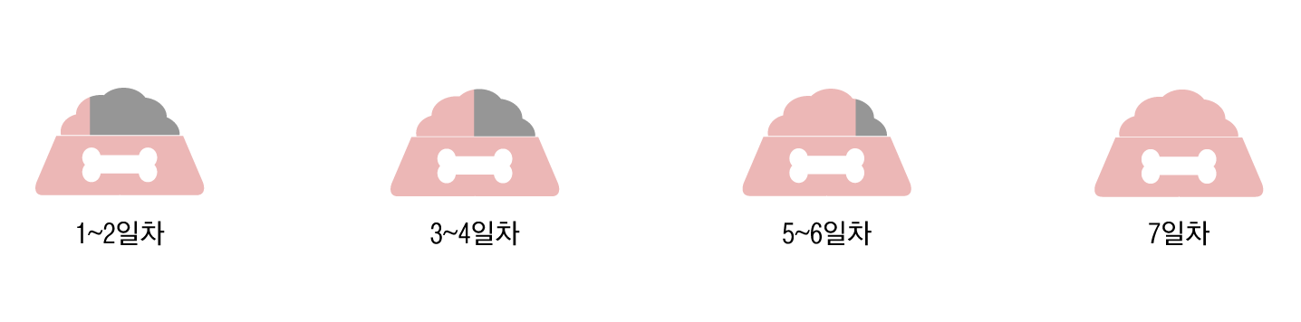 - 1~2일차 : 새로운 사료 25%, 기존 사료 75%