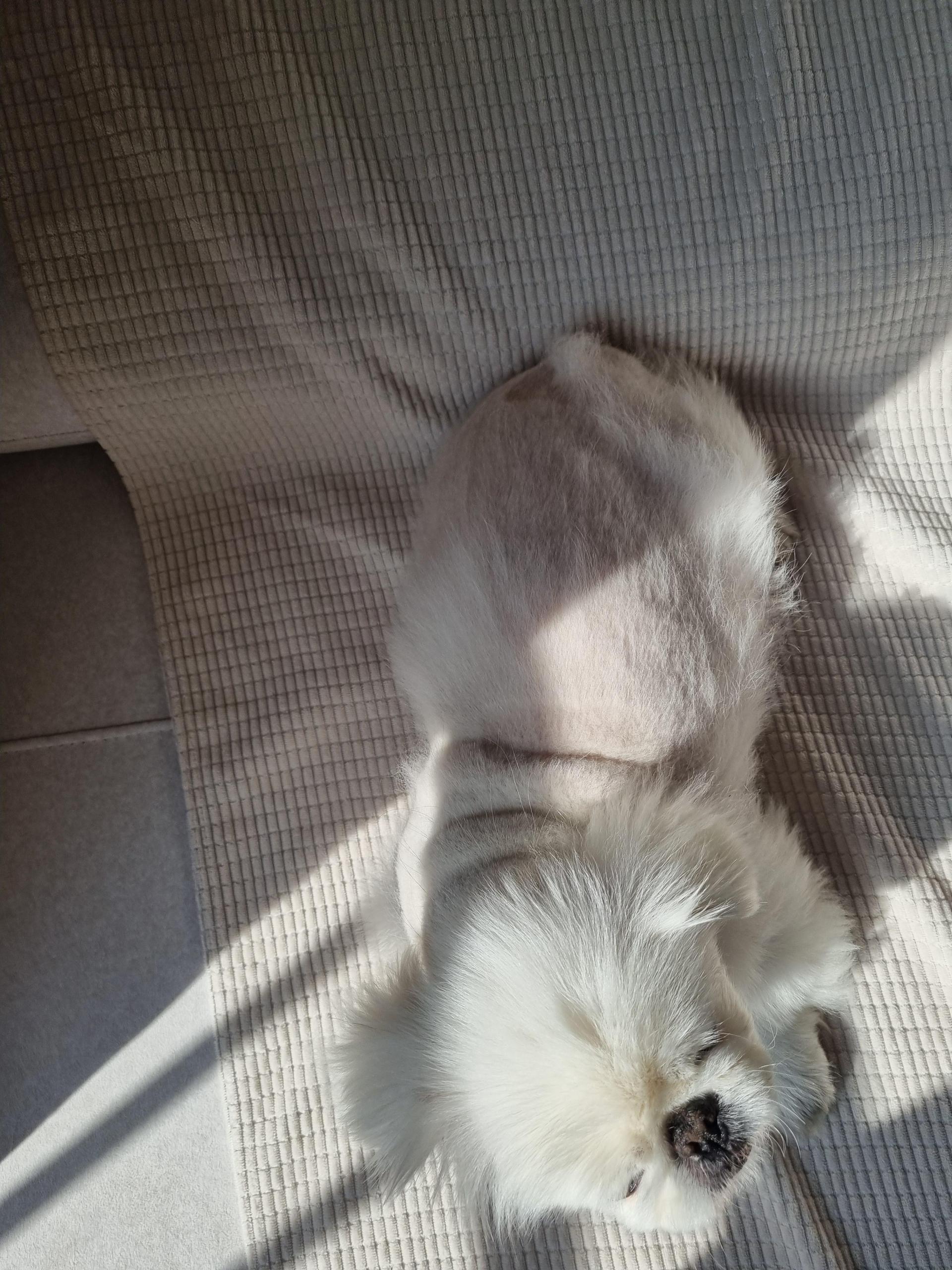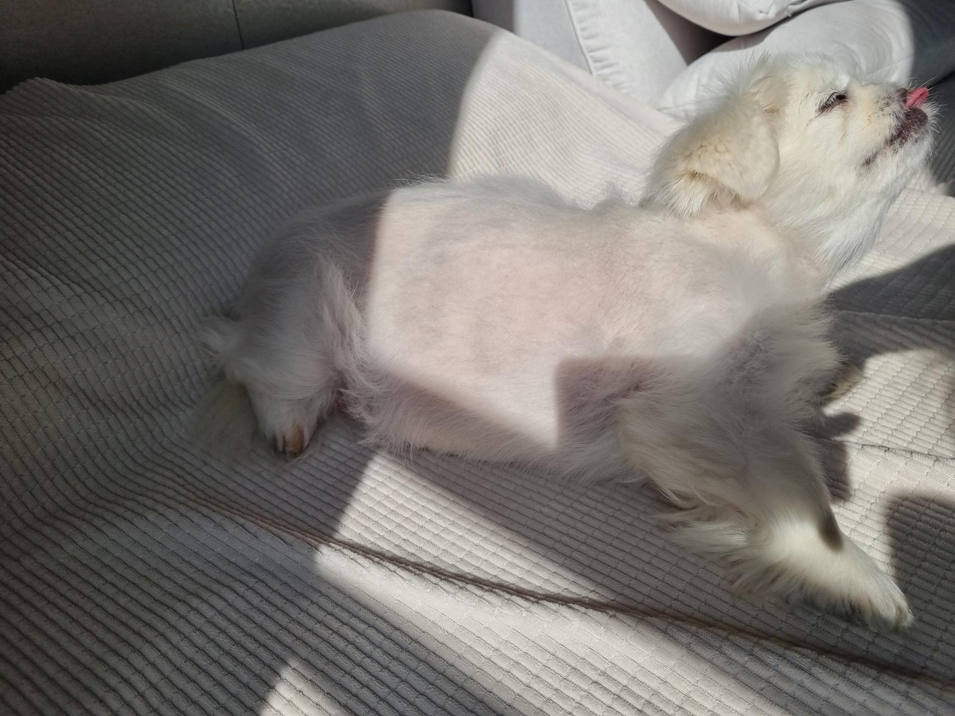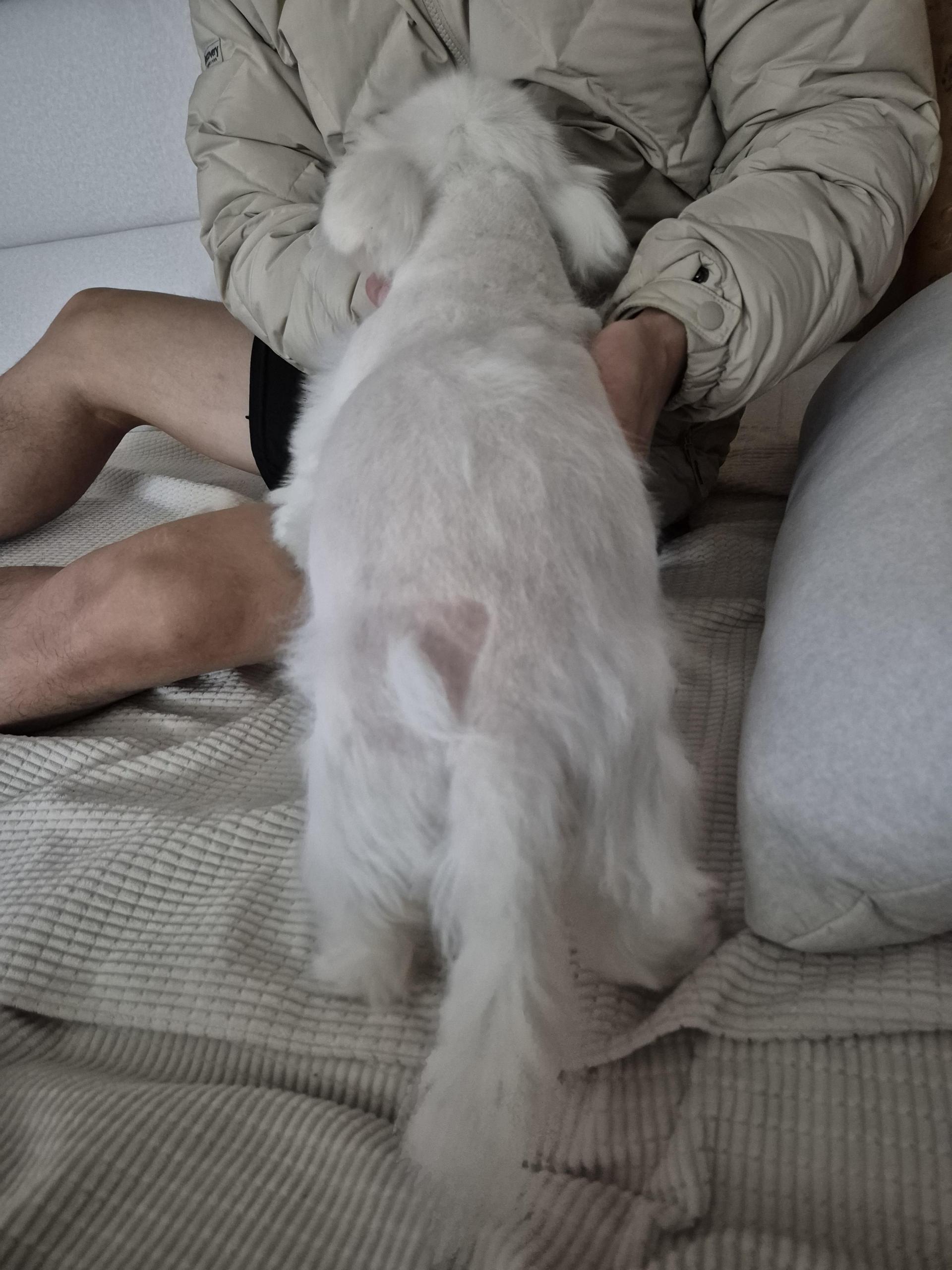뭉이는 위생 미용을 진행하였으며, 털이 일부 부위에서 자라고 있다는 점이 확인되었습니다.