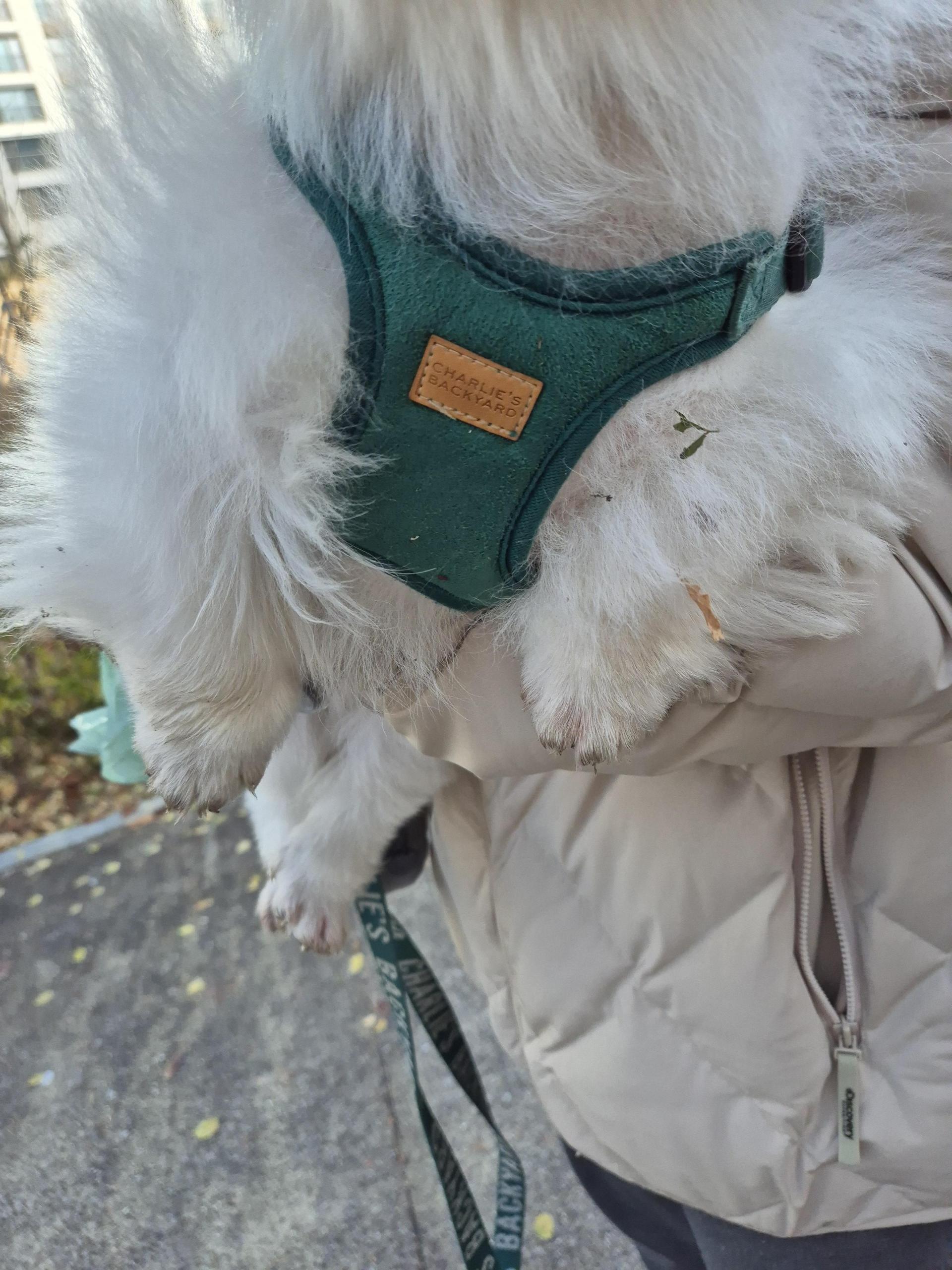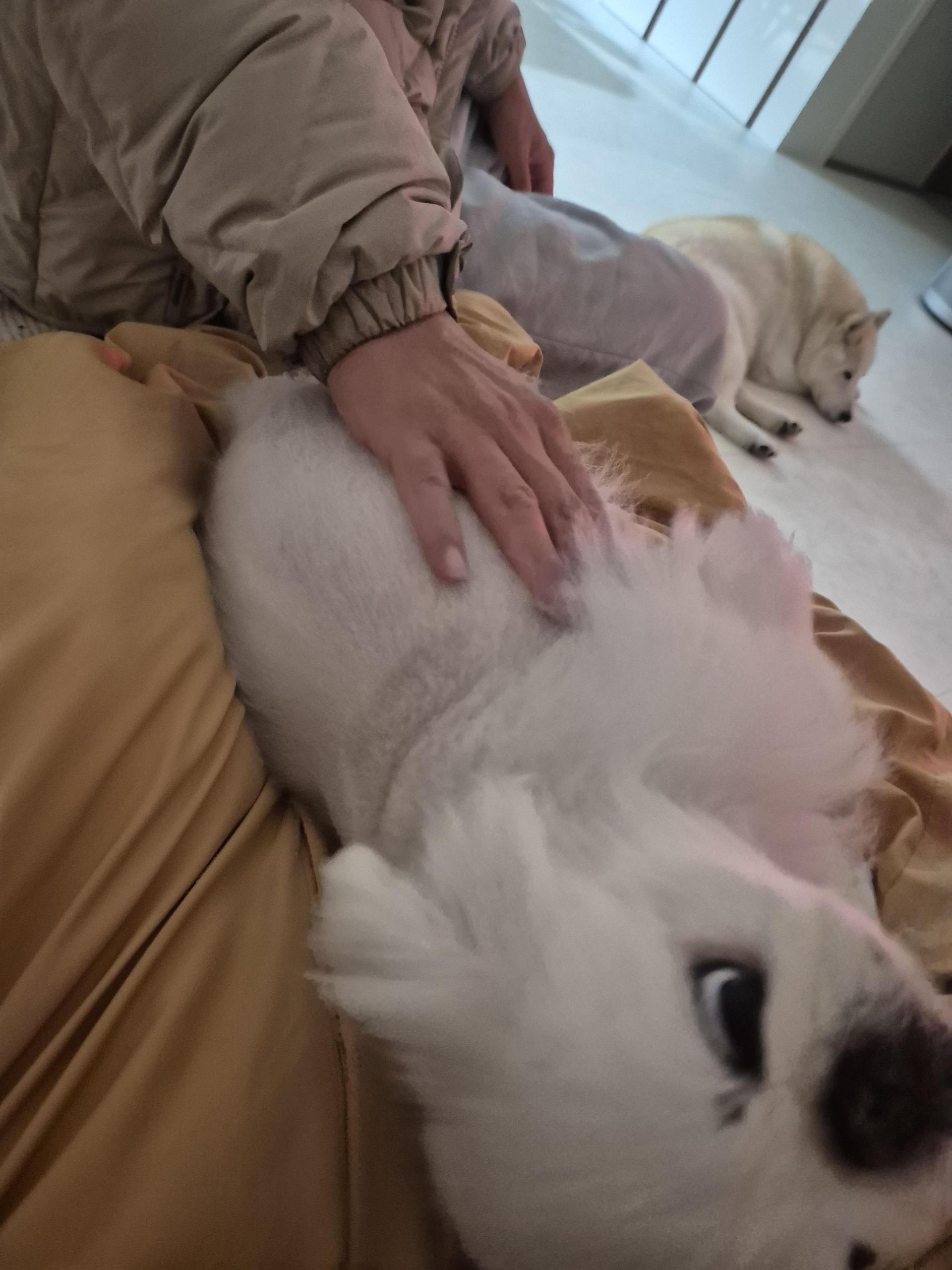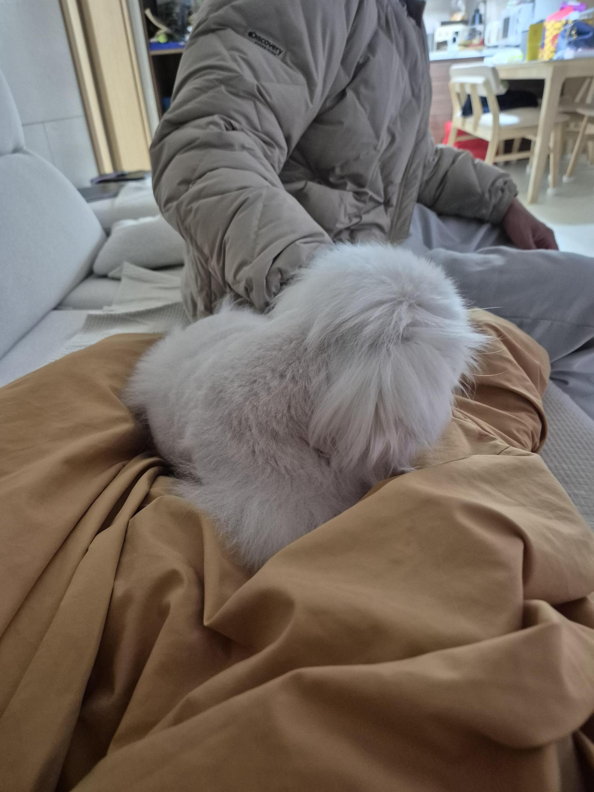 눈으로 인해 뭉이의 복부가 젖어 의류를 착용하였다는 설명을 받았고, 계절감을 충분히 느끼는 것이 모낭 활동을 보다 활발하게 유지하는 데 도움이 된다는 내용을 안내하였습니다.
