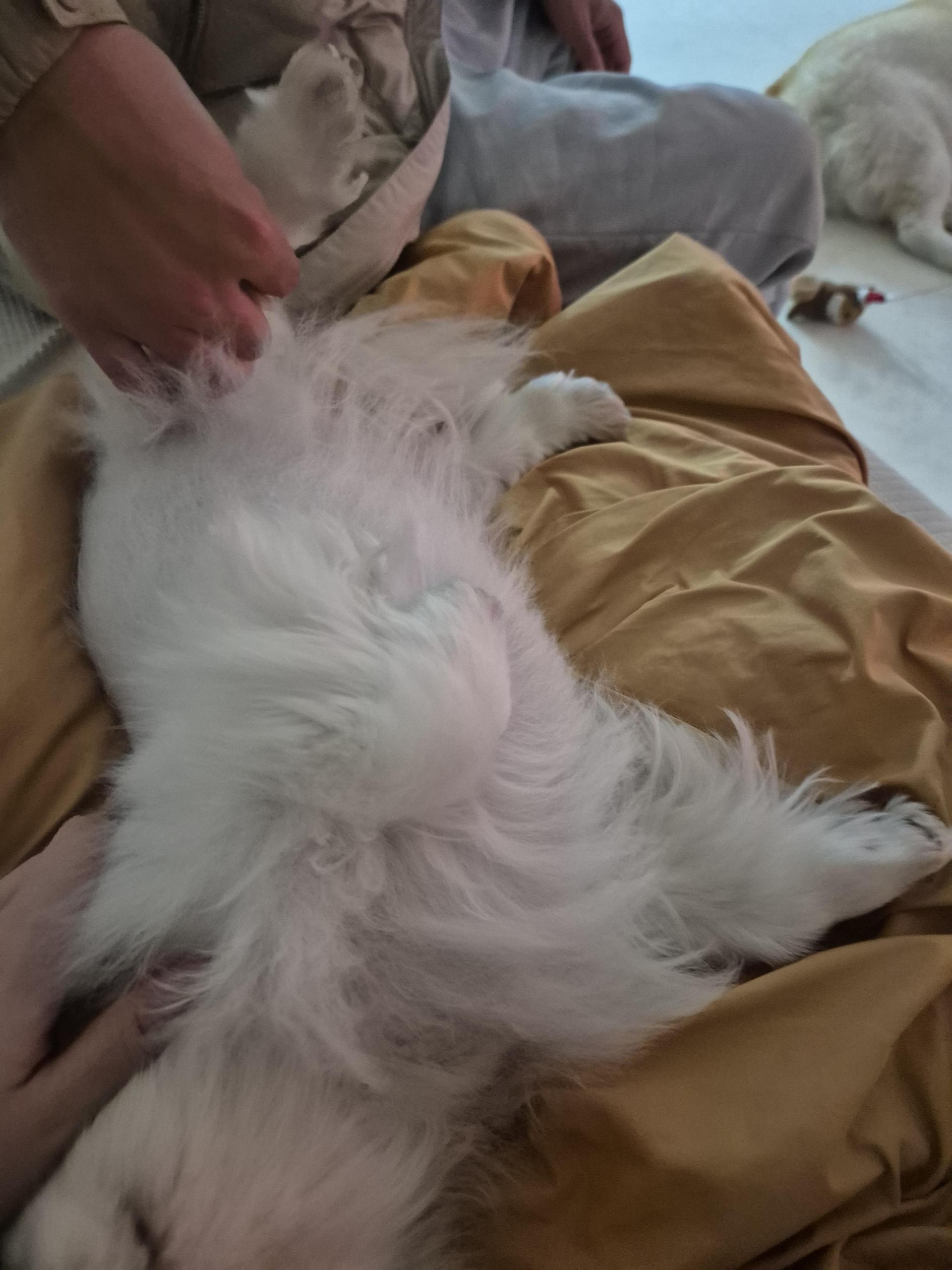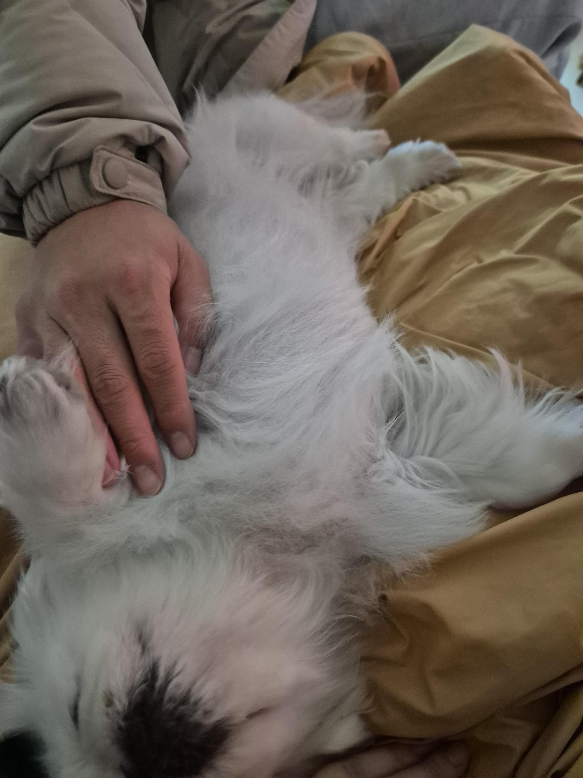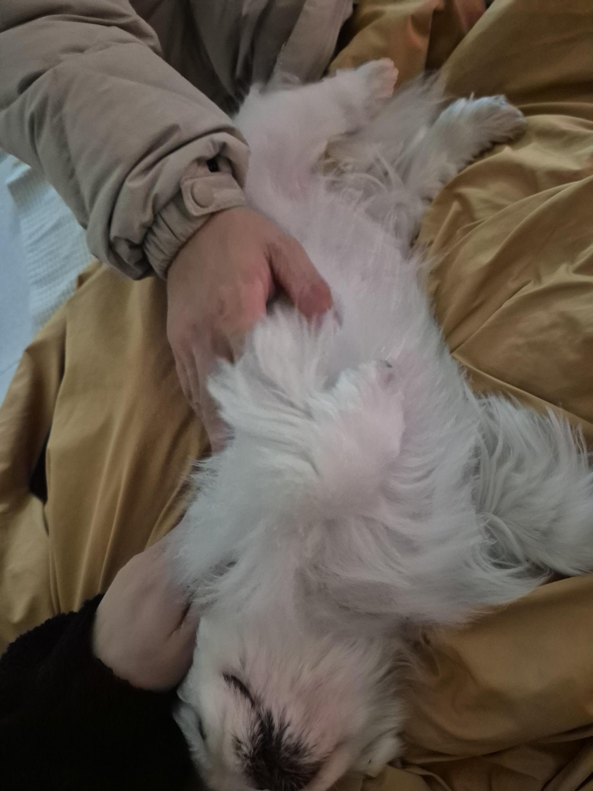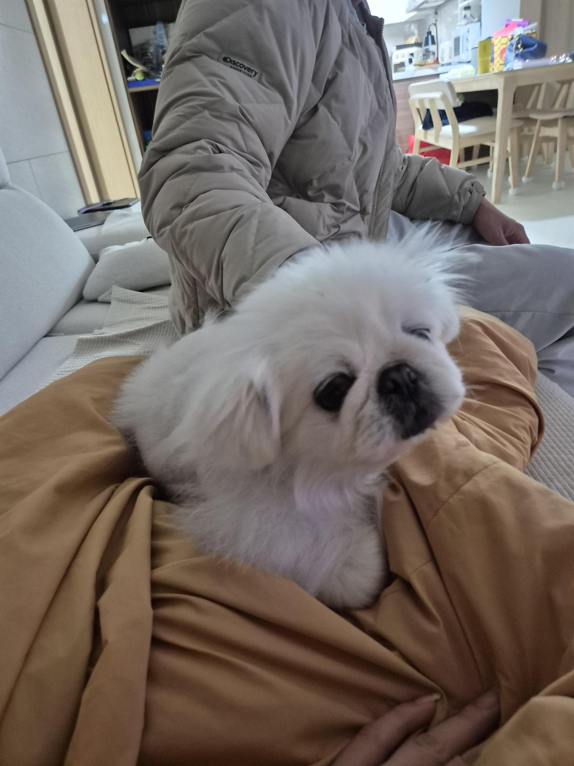 눈으로 인해 뭉이의 복부가 젖어 의류를 착용하였다는 설명을 받았고, 계절감을 충분히 느끼는 것이 모낭 활동을 보다 활발하게 유지하는 데 도움이 된다는 내용을 안내하였습니다.