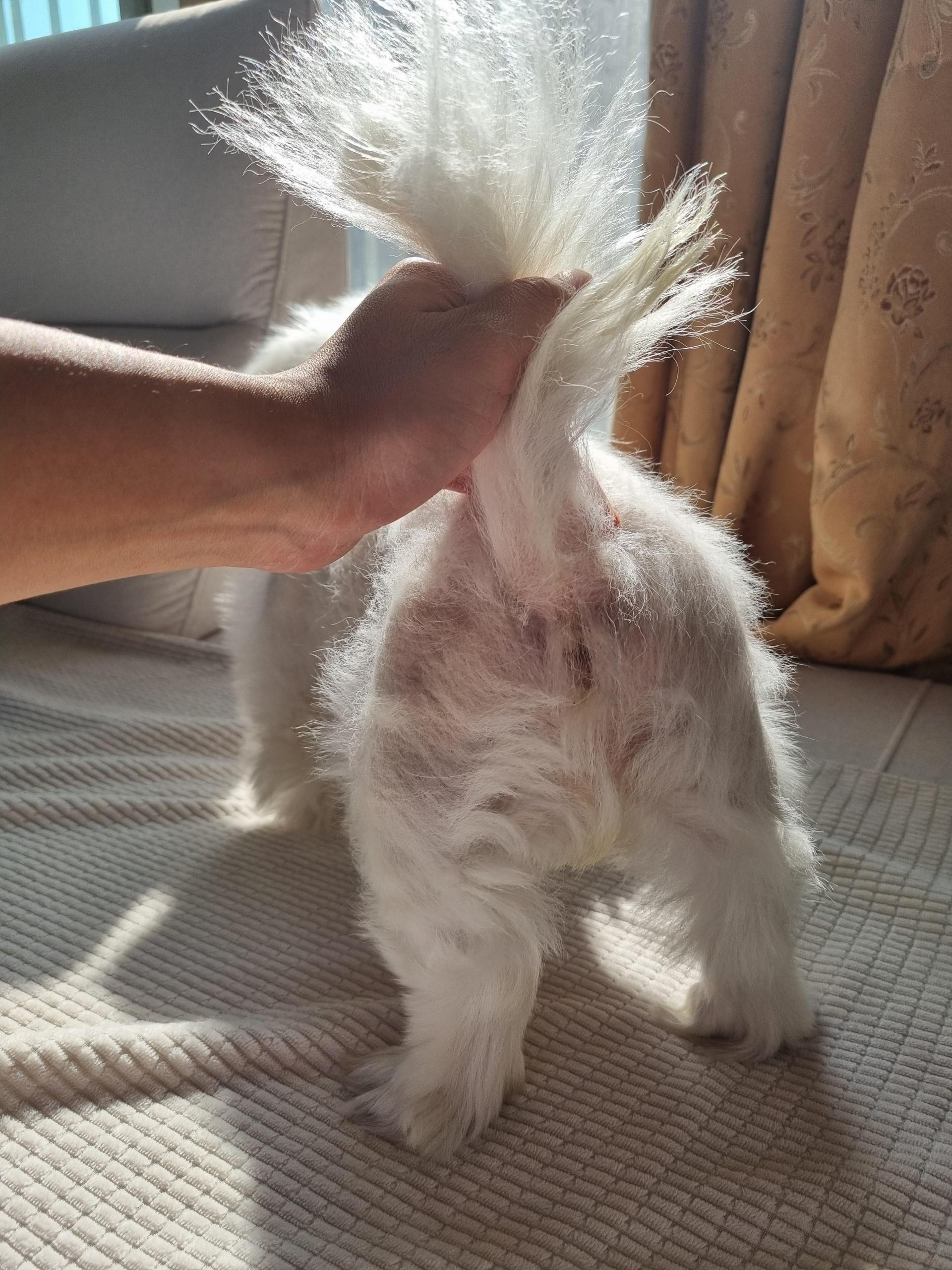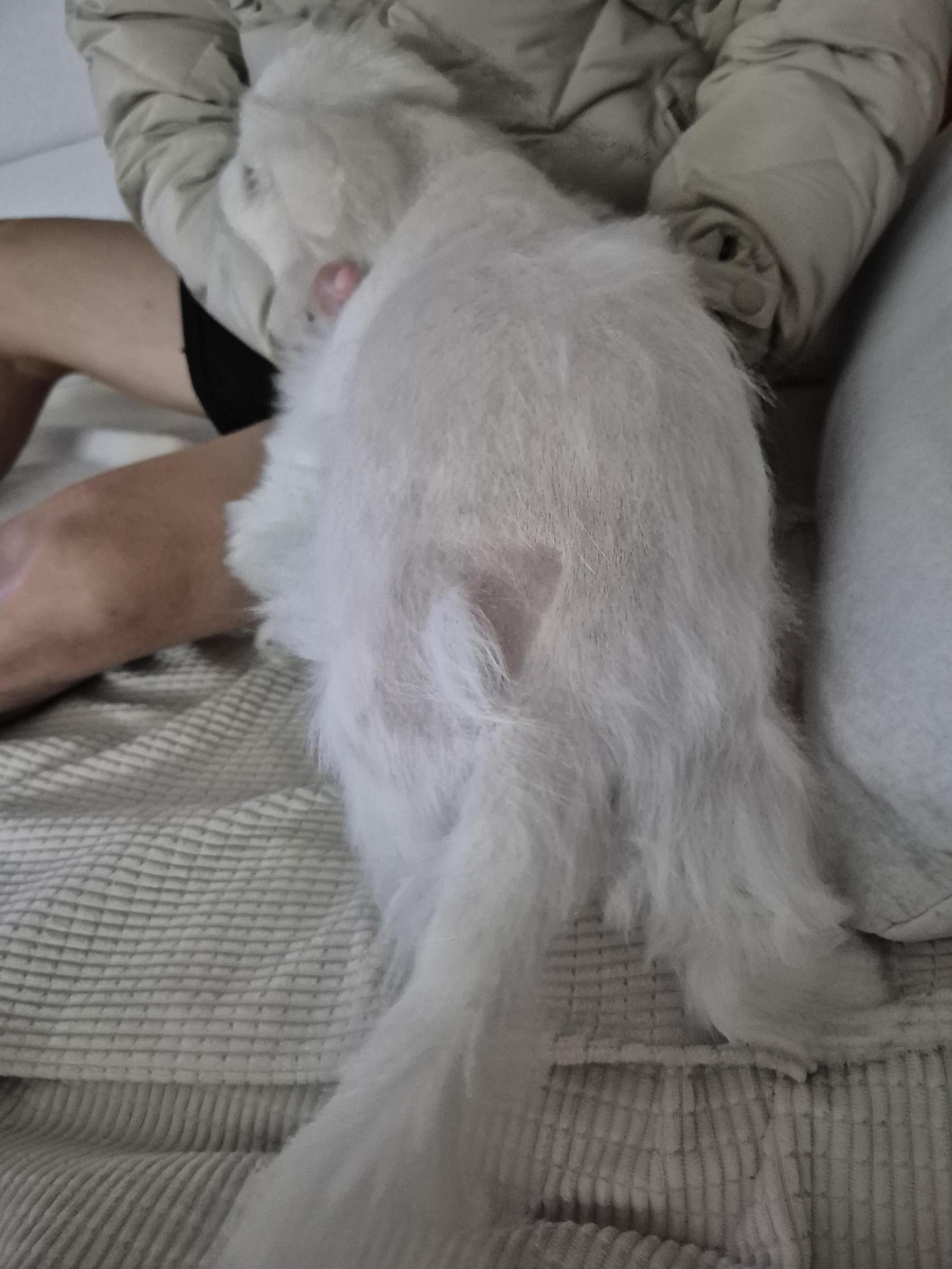 털이 탈모 수준은 아니나, 연령의 영향으로 털 성장 속도가 느리고 모량이 전반적으로 적은 편입니다. 이와 함께 피지낭종이 반복적으로 발생하고, 발사탕 증상도 가끔 관찰됩니다.