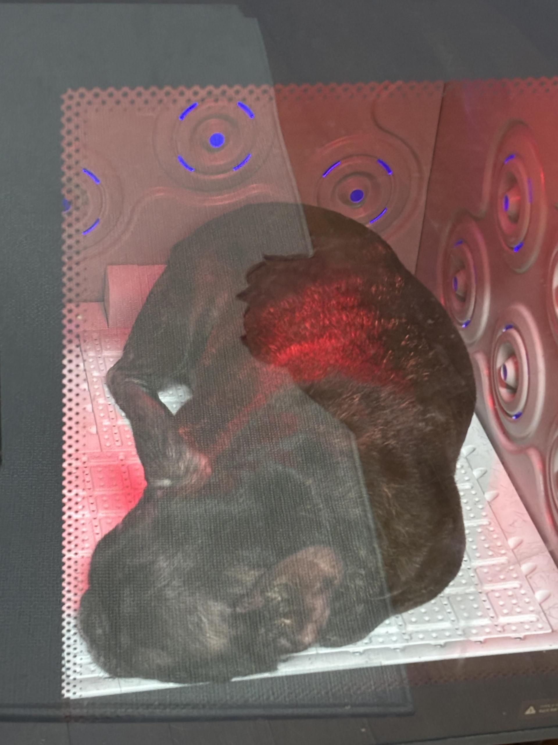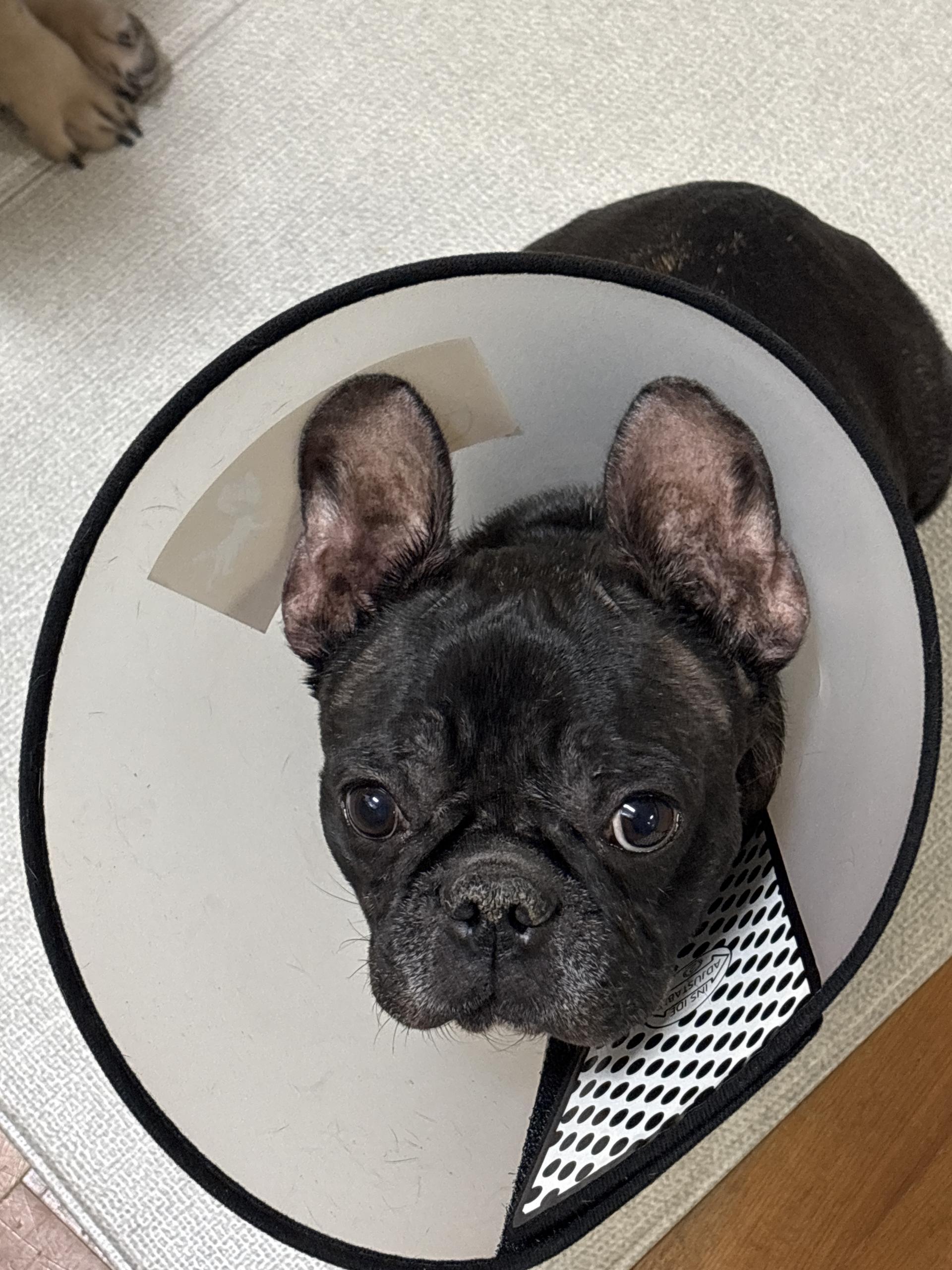 스테로이드 치료를 최소화하기 위해 외부 활동을 제한하고 넥카라를 상시 착용 중이며, 털이 없는 상태에서 넥카라 착용이 지속되어 목 부위 각화가 진행된 상태로 전달받았습니다.