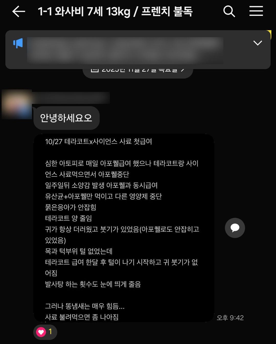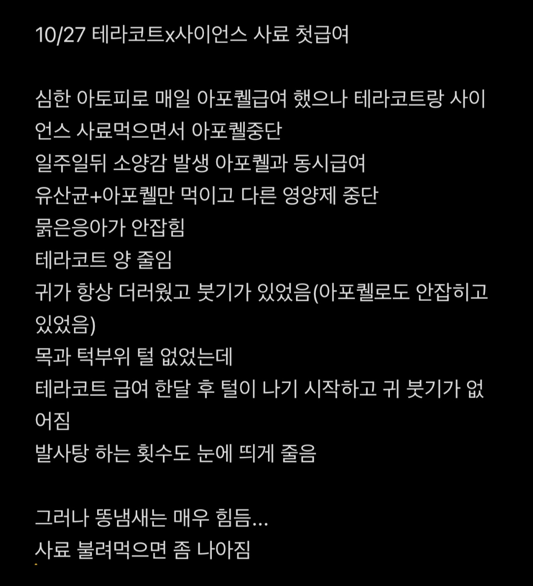 어릴 때부터 아토피 증상이 지속되어 사이토포인트와 아포퀠을 급여 중이며, 증상 호전이 부족할 경우 스테로이드를 병행 급여하고 있습니다.