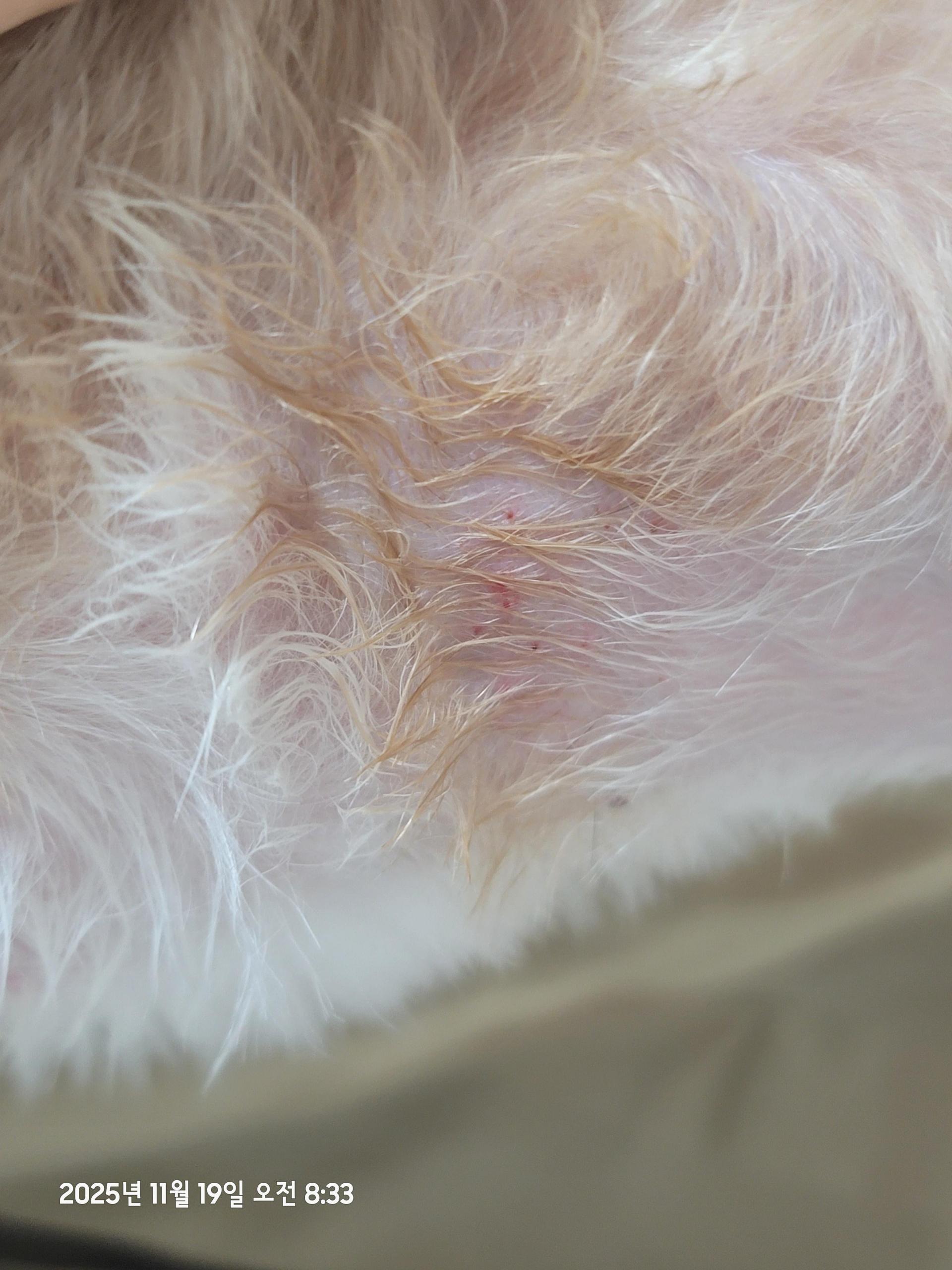 과한 가려움과 눈물 과다, 목욕 후 긁음으로 인한 상처 발생이 반복되고 있다는 피드백을 받았습니다.