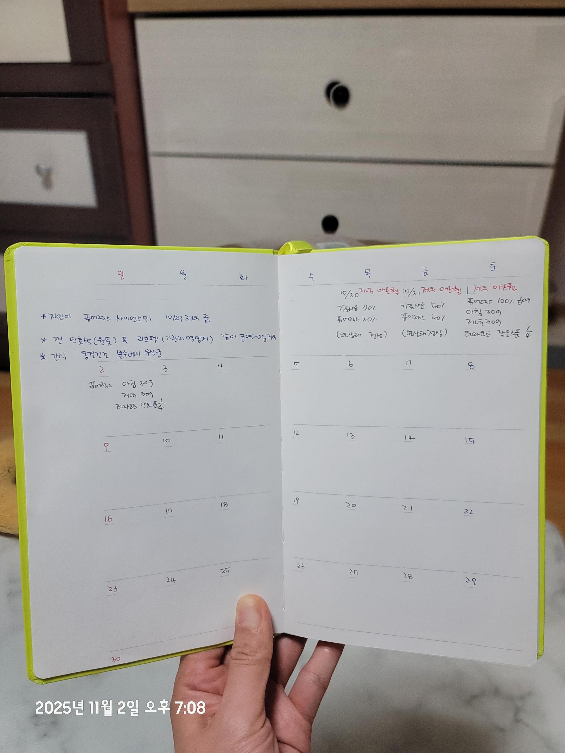 간식 추가 급여 관련 문의가 있었으며, 급여 내역을 다이어리에 기록하며 관리 중이라는 내용을 전달받았습니다.